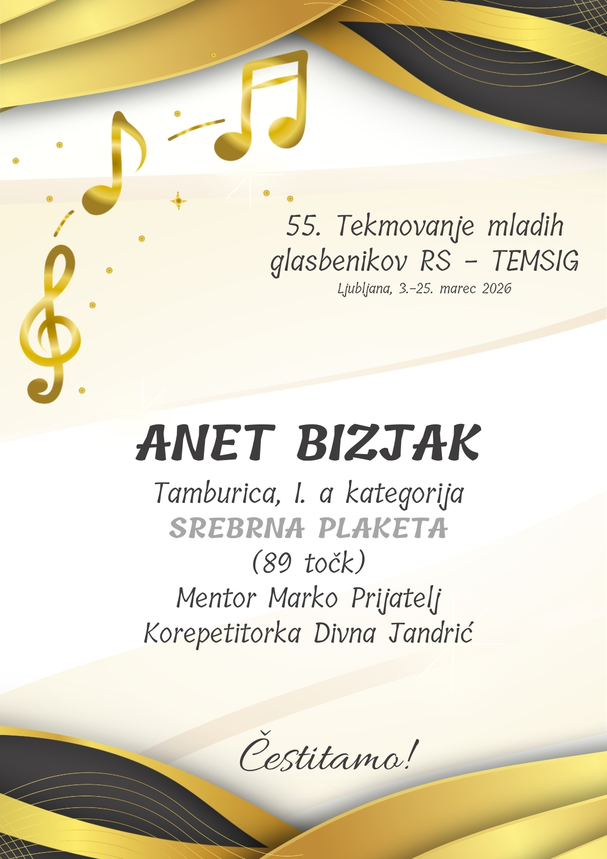 Sreda, 4. marca, je bila za naše tekmovalce zelo pester dan. V Glasbeni šoli Matije Tomca sta v disciplini tamburica nastopili Eli Marc in Anet Bizjak iz razreda Marka Prijatelja. Obe sta tekmovali v 1. a kategoriji, pri klavirju ju je spremljala Divna Jandrić. ELI MARC je prejela 90,67 točke, ZLATO PLAKETO in 3. NAGRADO. ANET BIZJAK je osvojila SREBRNO PLAKETO za doseženih 89 točk. Obema nagrajenkama, mentorju in korepetitorki iskreno čestitamo.