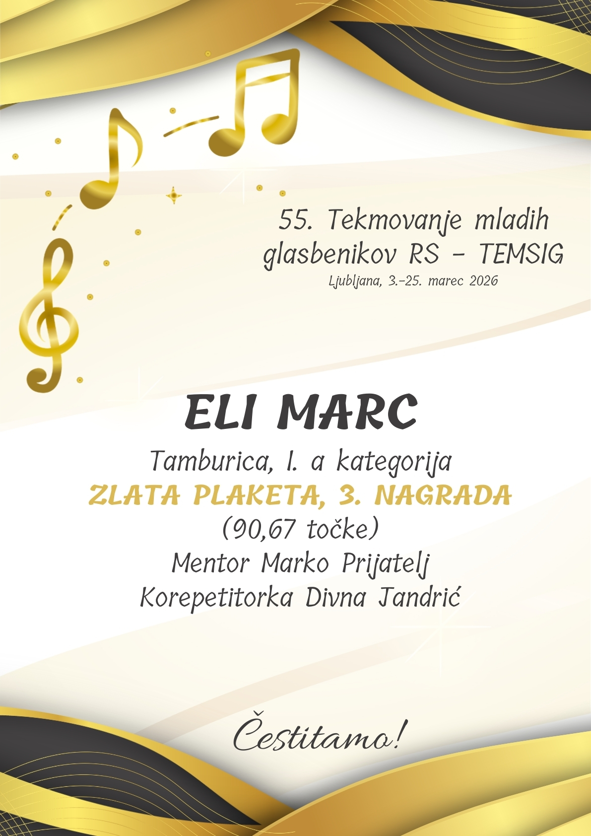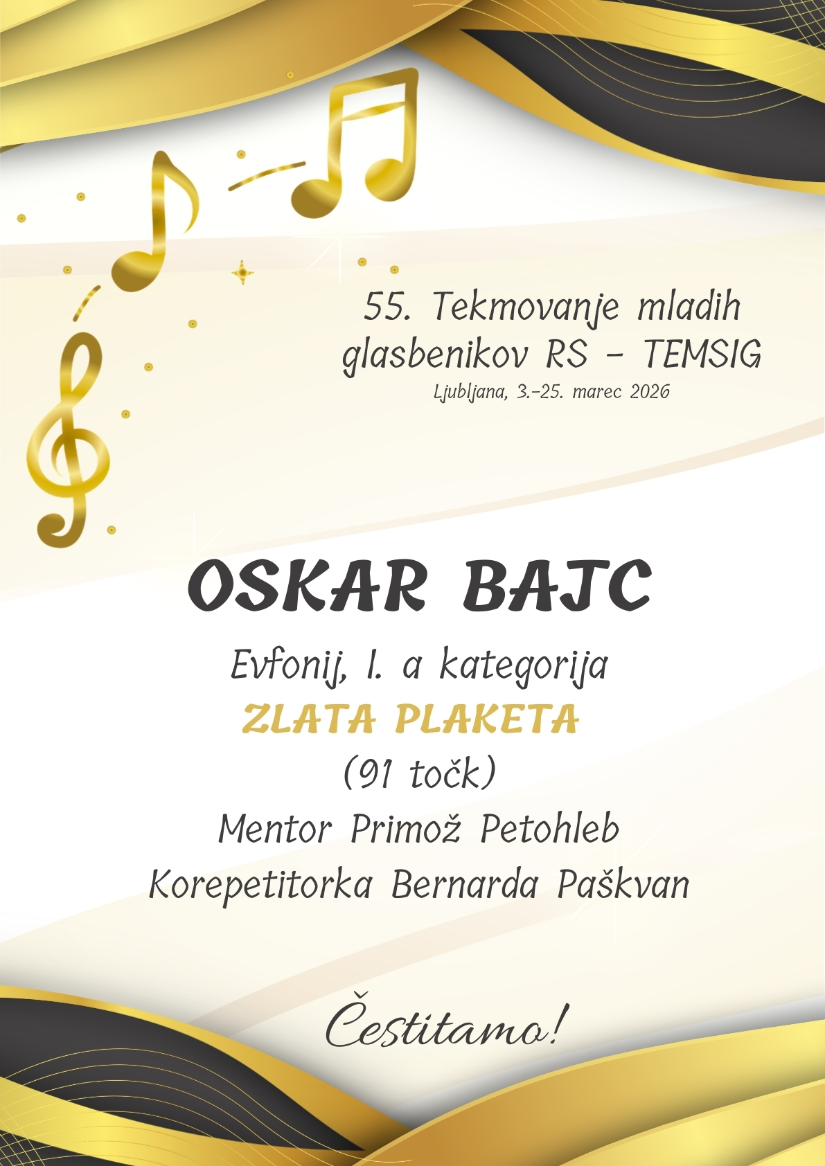 Že prvi tekmovalni dan, 3. marca, je OSKAR BAJC iz razreda Primoža Petohleba v I. a kategoriji za svoj nastop z evfonijem prejel 91 točk in s tem ZLATO PLAKETO. Iskrene čestitke Oskarju, njegovemu mentorju in korepetitorki Bernardi Paškvan.
