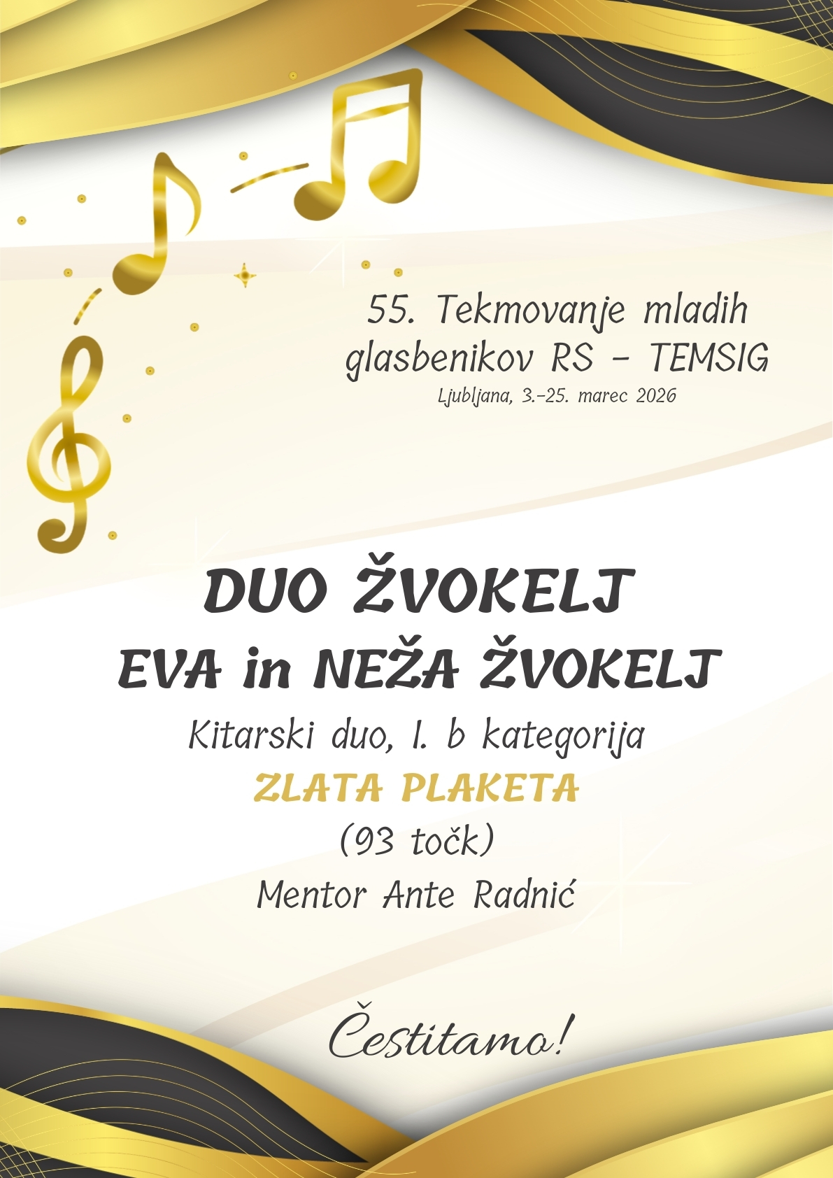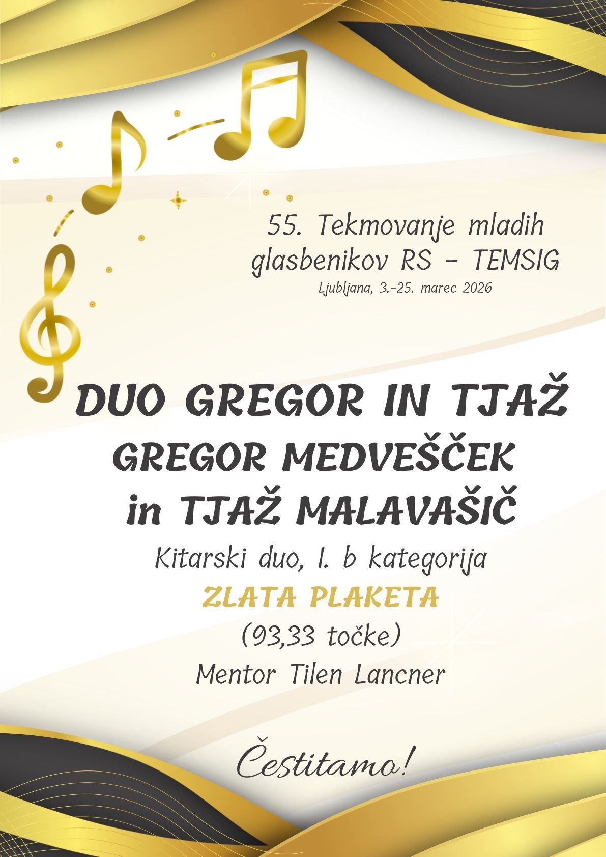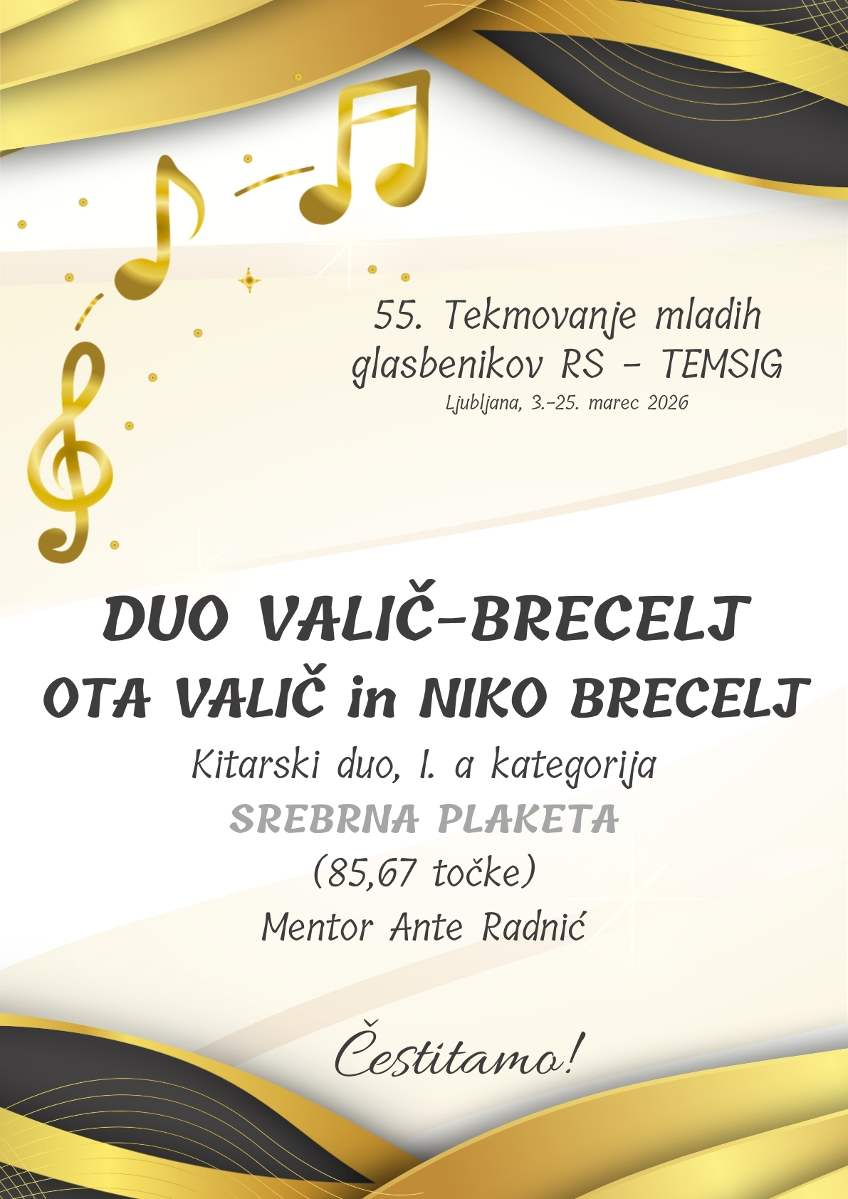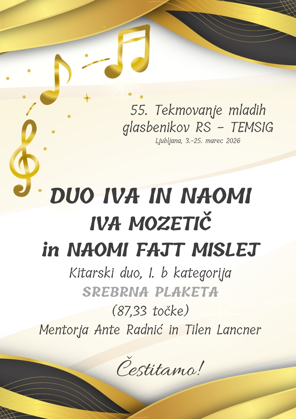 Ves dan je potekalo tudi tekmovanje kitarskih duov. OTA VALIČ in NIKO BRECELJ sta tekmovala v 1. a kategoriji in prejela 85,67 točke in SREBRNO PLAKETO. Njun mentor je Ante Radnić. V hudi konkurenci 1. b kategorije so nastopili trije naši dui. GREGOR MEDVEŠČEK in TJAŽ MALAVAŠIČ iz razreda Tilna Lancnerja sta prejela 93,33 točke in ZLATO PLAKETO. Tik za njima sta se na lestvici uvrstili sestri EVA in NEŽA ŽVOKELJ pod mentorstvom Anteta Radnića. Prejeli sta 93 točk in prav tako ZLATO PLAKETO. IVA MOZETIČ in NAOMI FAJT MISLEJ sta dosegli 87,33 točke in prejeli SREBRNO PLAKETO. Njuna mentorja sta oba naša učitelja kitare – Ante Radnić in Tilen Lancner. Vsem iskreno čestitamo!